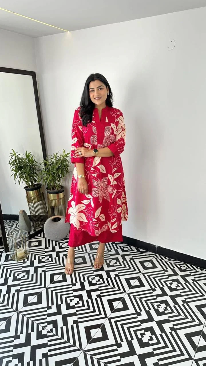 Make a vibrant statement with this stunning fuchsia kurti set featuring oversized ivory floral prints. Crafted in breathable fabric, the kurti showcases a notched neckline and three-quarter sleeves, paired with matching solid pants for a balanced yet eye-catching look. Perfect for casual outings or festive get-togethers, this ensemble exudes charm and comfort effortlessly.